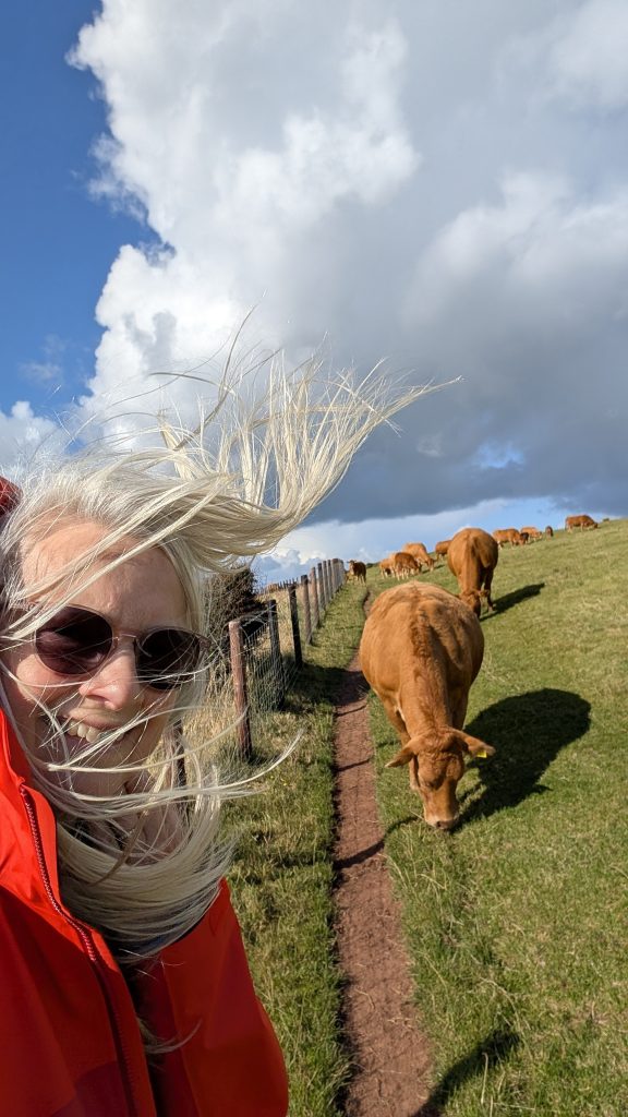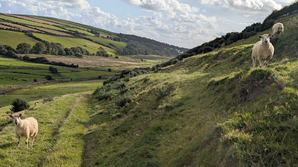 It was also around this point that I realised I had been in such a hurry to dump my bag and get out on the trail on the sun that (a) I hadn’t brought any water (and I was now thirsty, one of the things I had promised my husband I would not let happen, with my new last year easy to sip hydropak), and (b) I hadn’t brought my funky umbrella system (yet to be tested) or waterproof trousers (and it was now raining) and (c) hadn’t brought my poles (which I could have used to help jump over the mud and make quicker progress over the bumpy fields. Luckily for me it did stop raining before too long and I only had 4k to wait for a drink.The way back to St Bees then went across fields, with plenty of sheep (and mud), and at 13k joined Wood Lane which at 14k came to the old school, so left turn back through St Bees to Stone House Farm (3hrs almost exactly as my host had said) and a drink of water! A lovely start to the c2c, and I changed my breakfast to 8am since I didn’t need the early start anymore! After a nice warm shower I headed to the Queen’s pub/hotel for a fish chips and mushy peas dinner and a half of the local beer (Black Sheep).